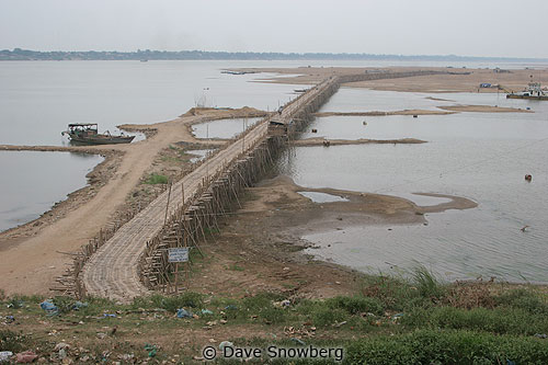 This handmade bamboo bridge, re-built every year for the dry season, leads out to an island where people live and farm. Even a car came down this thing while we were riding on it! We had to balance on the edge and I nearly got my toe run over.