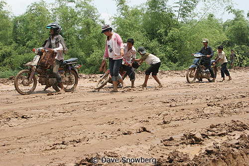 We expected today to be short and easy, with only about 30 km to ride. It was raining when we woke up, and by the time we got out of the hotel it was only sprinkling. A Cambodian driving the other way said he went through road construction much of the way from Kratie to Chlong the day before and he thought it would be a bit difficult. We rode about four kilometers out of town and saw the beginning of the road construction: a very wet, muddy clay coated the surface and most people were stopped to consider the odds of making it through. A major portion of traffic in Cambodia is motos, and there were a few trying to get through. Normally we see anywhere from one to five people on one motorbike, and most moto passengers were walking, barefoot, through the mud behind struggling drivers. Many a scooter went down, and there was a huge crowd of locals watching the spectacle. Some attacked with speed, others on bare tip-toes keeping the bike upright while barely inching forward. The sprinkle became a full rain again, so we turned around to wait it out in a restaurant.